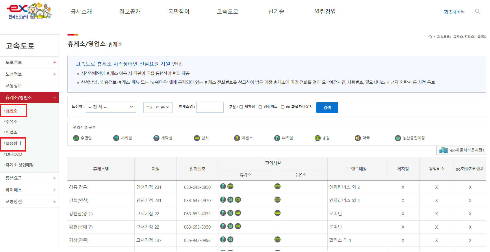 고속도로>휴게소/영업소 카테고리에 들어가면